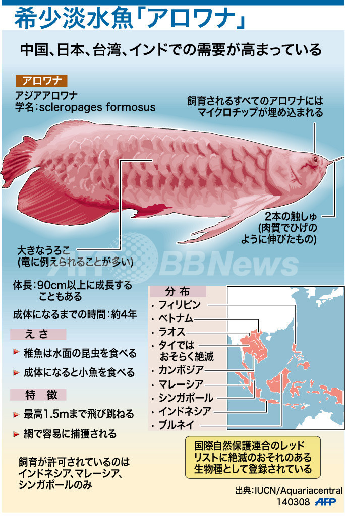 ニュース 環境・科学 図解 【図解】希少淡水魚「アロワナ」とは? 2008年3月18日 15:19 発信地:ジャカルタ/インドネシア [ アジア・オセアニア インドネシア ] このニュースをシェア (c)AFP 【3月18日 AFP】図は、アジアを中心に人気が高まっている希少淡水魚「アロワナ(Arowana)」の特徴、分布などを示す。(c)AFP<ニュース解説画像一覧へ> 環境・科学 一覧へ> メディア・報道関係・法人の方向け 写真・動画 購入のお問合せ>