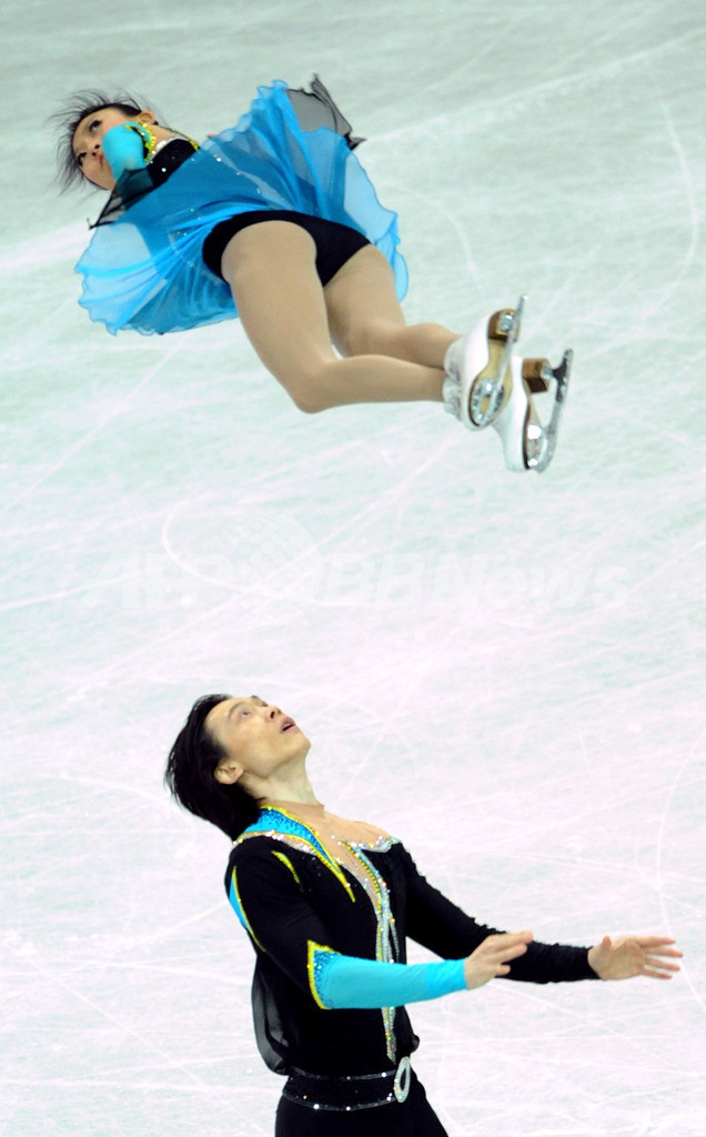 【3月19日 AFP】08世界フィギュアスケート選手権(ISU World Figure Skating Championships 2008)、ペア・ショートプログラム。中国の張丹(Zhang Dan、ツァン・ダン)/張昊(Zhang Hao、ツァン・ハオ)組は、74.36点を記録して首位に立った。