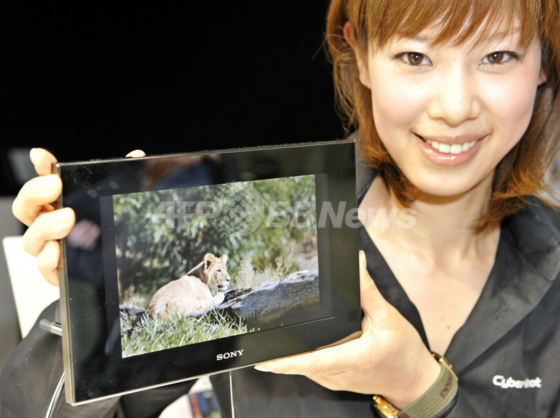 9型液晶パネルタイプは、内蔵メモリーは512MB、多種メモリーカードに対応する「マルチカードスロット」を搭載し、別売のブルートゥース(Bluetooth)アダプターにも対応。また、写真表示のほか、スライドショー機能、時計・カレンダー表示機能や、これらの機能と写真表示との組み合わせも楽しめる。店頭販売は5月9日から。(c)AFP