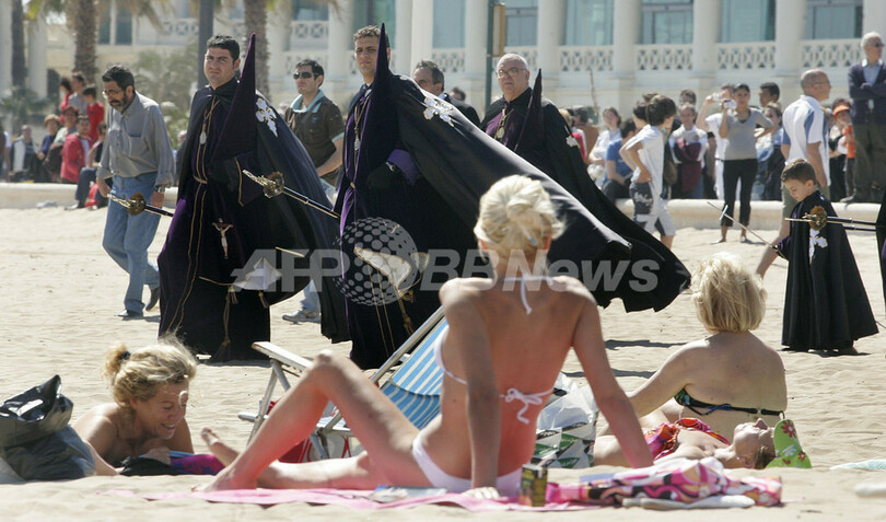 ニュース ライフ スペイン・バレンシアの海岸でもイースターの行進 2008年3月22日 19:23 発信地:バレンシア/スペイン [ ヨーロッパ スペイン ] このニュースをシェア ‹ › ❮ 4/15 ❯ 2008年3月21日、スペイン・バレンシア(Valencia)の海岸で、日光浴をする人々の間を通る、イエス・キリストの復活を記念する「復活祭(Easter)」の行進の列。(c)AFP/DIEGO TUSON 画像作成中 ! 【3月22日 AFP】スペインでは、イエス・キリストの復活を祝う「復活祭(Easter)」前の「聖週間(Holy Week)」の間、各地で数百の行進が行われ、またそれを目当てに数千人の観光客が訪れる。 東部バレンシア(Valencia)の海岸でも21日、砂浜で日光浴する人々の間を、キリスト像を担いだ行進の列が進んだ。(c)AFP ライフ 一覧へ> メディア・報道関係・法人の方向け 写真・動画 購入のお問合せ>