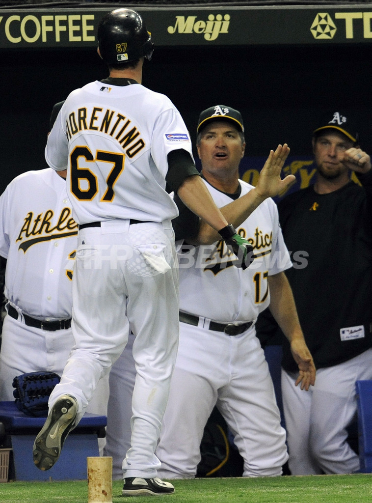 スポーツ 野球 アスレチックス 読売ジャイアンツに勝利 2008年3月23日 7:57 発信地:東京 [ アジア・オセアニア 東京 ] このニュースをシェア ‹ › ❮ 5/10 ❯ 9回に追加点を決めてベンチでボブ・ゲレン(%%Bob Geren%%)監督に迎えられるアスレチックスのジェフ・フィオレンティーノ(%%Jeff Fiorentino%%、左)。(c)AFP/TOSHIFUMI KITAMURA 画像作成中 ! 【3月22日 AFP】(写真追加)3月25日から行われるボストン・レッドソックス(Boston Red Sox)との08MLB日本開幕シリーズに先駆けて行われた読売ジャイアンツ(Yomiuri Giants)とのプレシーズンゲームに臨んだオークランド・アスレチックス(Oakland Athletics)は、4-3で勝利を収めた。(c)AFP 野球 一覧へ> メディア・報道関係・法人の方向け 写真・動画 購入のお問合せ>