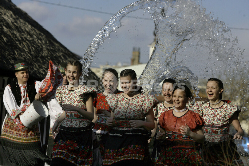 同地方では、少女に水をかけてイースターを祝う。キリスト教以前の時代からハンガリーの部族に伝わる風習で、起源は紀元前2世紀にさかのぼるという。(c)AFP