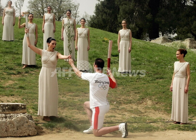 【3月24日 AFP】ギリシャ南西部、古代五輪発祥の地オリンピア(Olympia)で23日、北京五輪の聖火の採火式最終リハーサルが行われた。