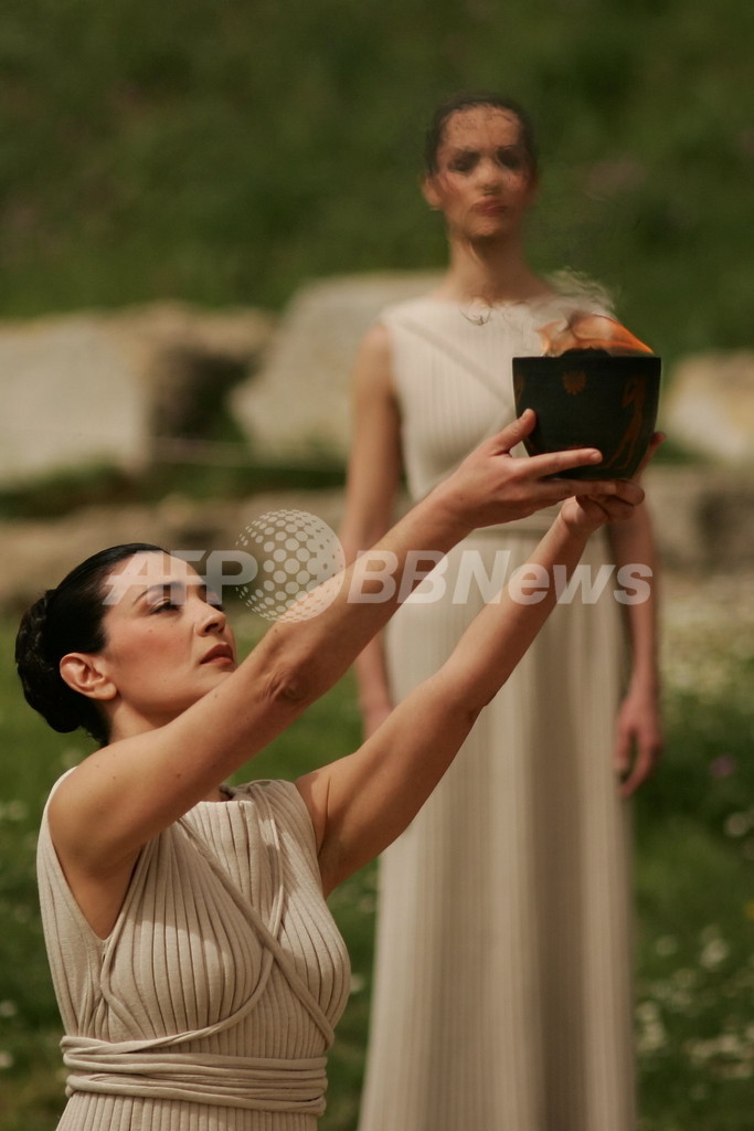【3月24日 AFP】ギリシャ南西部、古代五輪発祥の地オリンピア(Olympia)で23日、北京五輪の聖火の採火式最終リハーサルが行われた。