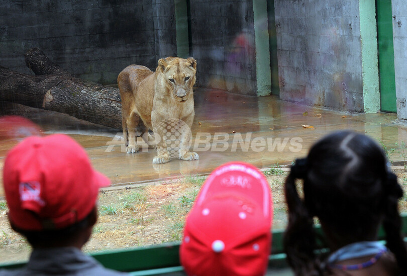 世界で3番目に大きなカメの種、ケヅメリクガメ(African spurred tortoise、学名Geochelone sulcata)やアフリカライオン、カピバラなどさまざまな動物を、地元の子どもたちが目を輝かせて見入っている。(c)AFP