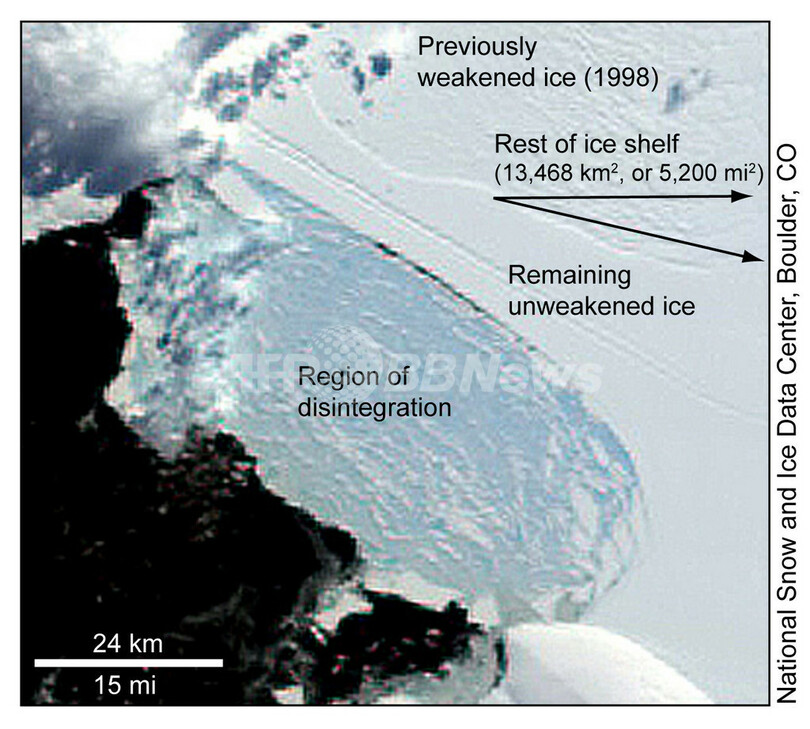 【3月26日 AFP】(3月29日 写真追加)南極大陸の南米側に突き出た南極半島(Antarctic Peninsula)にある南極最大のウィルキンス(Wilkins)棚氷の一部が、地球温暖化の影響で崩壊し始めていることが、米コロラド大学ボールダー校(University of Colorado in Boulder)の米国雪氷データセンター(National Snow and Ice Data Center、NSIDC)が公開した衛星画像で明らかとなった。