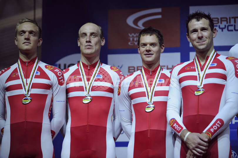 【3月28日 AFP】UCIトラック・サイクリング世界選手権2008(UCI Track Cycling World Championships 2008)、男子チームパシュート決勝。英国(エドワード・クランシー、Edward Clancy/トーマス・ジェラント、Geraint Thomas/ポール・マニング、Paul Manning/ブラドレー・ウイギンズ、Bradley Wiggins)は3分56秒322の世界新記録を記録し、デンマーク(ミカエル・フェルク・クリステンセン、Michael Faerk Christensen/カスパー・ヨルゲンセン、Casper Jorgensen/イェンス-エリック・マドセン、Jens-Erik Madsen/アレックス・ラスムッセン、Alex Rasmussen)を破り優勝を果たした。(c)AFP