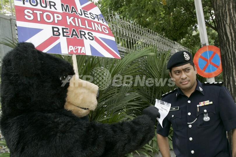 国際動物愛護団体PETA、クマの着ぐるみで英国に抗議 マレーシア