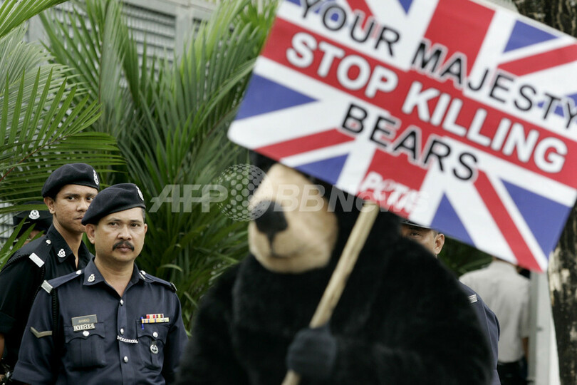 【3月29日 AFP】マレーシア・クアラルンプール(Kuala Lumpur)の英高等弁務官事務所(British High Commission)前で28日、クマの着ぐるみを着た国際動物愛護団体「動物の倫理的扱いを求める人々の会(People for the Ethical Treatment of Animals、PETA)」の活動家らが、英軍近衛兵の帽子用の毛皮を取るためにクロクマを虐殺しているとして抗議活動を行った。(c)AFP