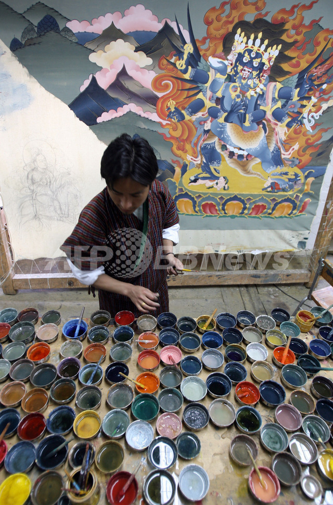 【3月30日 AFP】ヒマラヤ(Himalaya)山脈の小さな仏教国、ブータンの首都ティンプー(Thimphu)の美術学校で26日、画家が岩絵具を使って伝統的な絵画を描いていた。