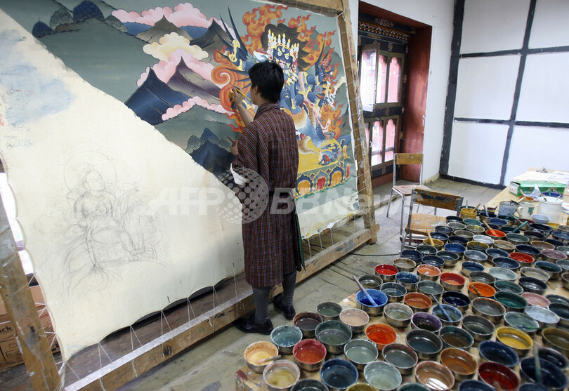 【3月30日 AFP】ヒマラヤ(Himalaya)山脈の小さな仏教国、ブータンの首都ティンプー(Thimphu)の美術学校で26日、画家が岩絵具を使って伝統的な絵画を描いていた。