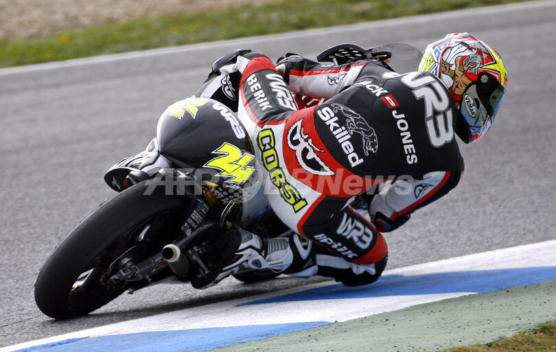【3月30日 AFP】(写真追加)世界ロードレース選手権(WGP 2008)第2戦スペインGP・125cクラス、決勝。ジャック&ジョーンズWRB(Jack & Jones WRB)のシモーネ・コルシ(Simone Corsi)は、41分46秒100をマークしてシーズン初優勝を飾った。