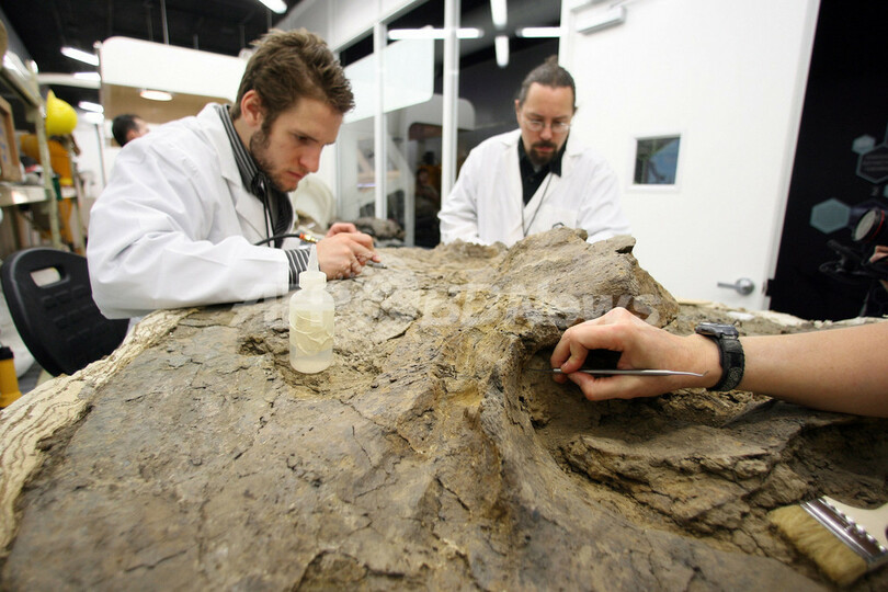 【3月31日 AFP】米ロサンゼルス(Los Angeles)にある自然史博物館(Natural History Museum)では、2003年から2005年の間にモンタナ(Montana)州で発掘され、「トーマス(Thomas)」と名付けられた約6600万年前のティラノサウルス・レックスの化石を組み立てる作業が進められている。「トーマス」は世界中で部分的に組み立てが済んでいる同種の化石30組のうちの1つで、作業の70%が完成しているとみられている。(c)AFP