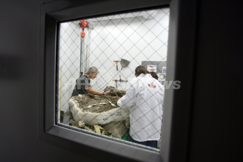 【3月31日 AFP】米ロサンゼルス(Los Angeles)にある自然史博物館(Natural History Museum)では、2003年から2005年の間にモンタナ(Montana)州で発掘され、「トーマス(Thomas)」と名付けられた約6600万年前のティラノサウルス・レックスの化石を組み立てる作業が進められている。「トーマス」は世界中で部分的に組み立てが済んでいる同種の化石30組のうちの1つで、作業の70%が完成しているとみられている。(c)AFP