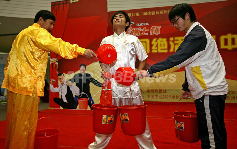 ニュース ライフ こぼれ話 中国の武術家、まぶたでバケツ2杯の水を持ち上げる「秘技」披露 2008年4月1日 11:06 発信地:泉州/中国 [ 中国・台湾 中国 ] このニュースをシェア ‹ › ❮ 2/2 ❯ 2008年3月30日、中国南東部の福建(%%Fujian%%)省泉州(%%Quanzhou%%)で技を披露する中国人武術家の%%Fu Yingjie%%(中央)。(c)AFP 画像作成中 ! 【4月1日 AFP】中国南東部の福建(Fujian)省泉州(Quanzhou)で3月30日、中国人武術家のFu Yingjieさんが、まぶただけで水の入ったバケツ2杯を持ち上げるという技を披露した。Fuさんが武術を学び始めたのは6歳の時。武術は3100年以上前から先祖代々、Yingjie家に生まれた男性のみに伝授されているという。(c)AFP ライフ 一覧へ> メディア・報道関係・法人の方向け 写真・動画 購入のお問合せ>