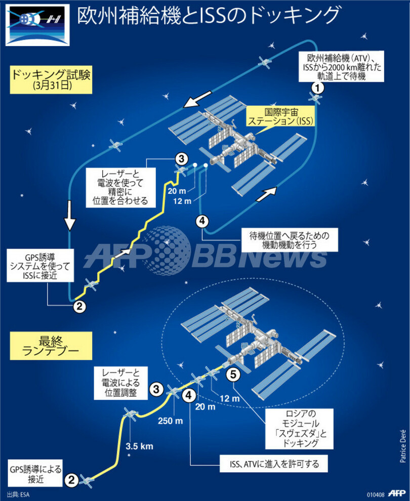 ニュース 環境・科学 図解 【図解】欧州補給機と国際宇宙ステーションのドッキング 2008年4月3日 5:46 発信地:フランス領ギアナ [ 中南米 フランス領ギアナ ] このニュースをシェア (c)AFP 【4月3日 AFP】図は、欧州補給機(ATV)と国際宇宙ステーション(International Space Station、ISS)のドッキングを示したもの。(c)AFP <ニュース解説画像一覧へ> 環境・科学 一覧へ> メディア・報道関係・法人の方向け 写真・動画 購入のお問合せ>