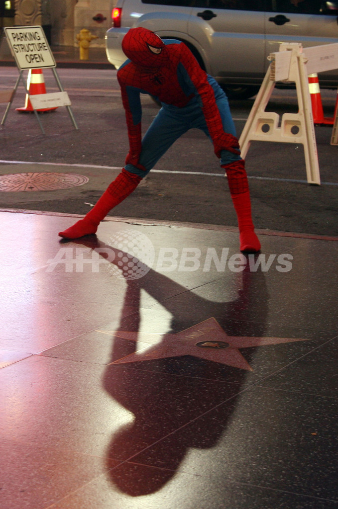2008年4月3日、カリフォルニア(California)州のハリウッド大通り(Hollywood Boulevard)で、観光客を待つ「スパイダーマン(Spiderman)」。(c)AFP/GABRIEL BOUYS