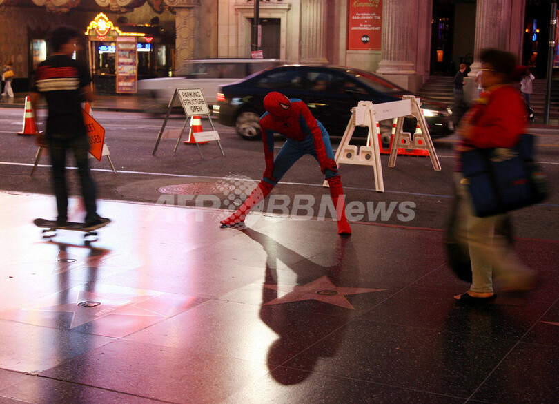 2008年4月3日、カリフォルニア(California)州のハリウッド大通り(Hollywood Boulevard)で、観光客を待つ「スパイダーマン(Spiderman)」。(c)AFP/GABRIEL BOUYS