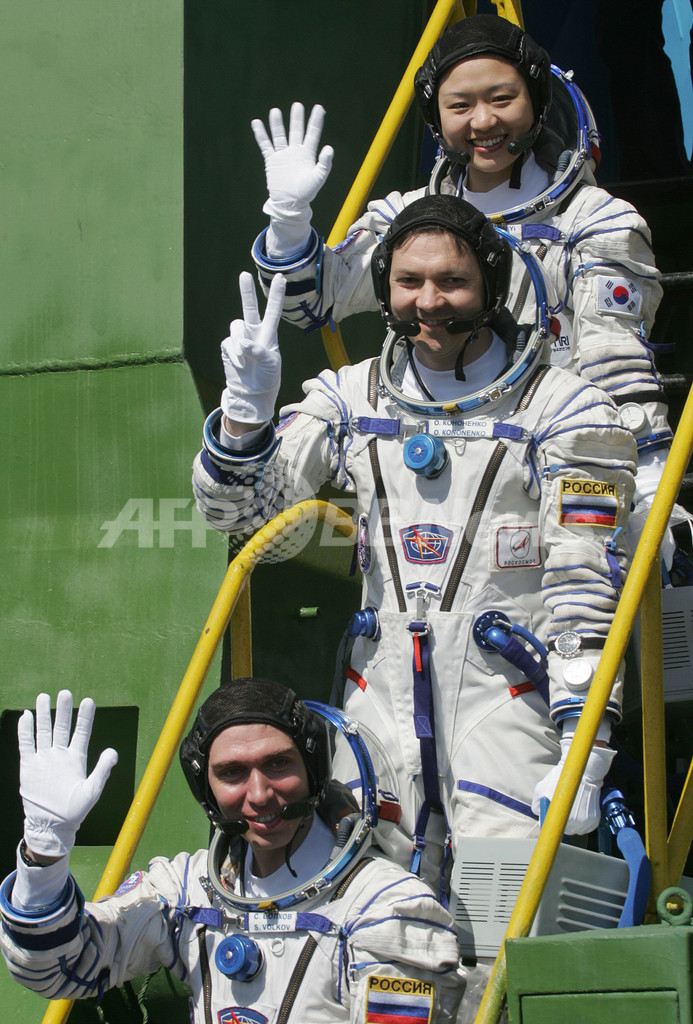 ニュース 環境・科学 韓国初の宇宙飛行士、ソユーズ打ち上げ 2008年4月8日 22:49 発信地:バイコヌール/カザフスタン [ ロシア・CIS カザフスタン ] このニュースをシェア ‹ › ❮ 20/20 ❯ 2008年4月8日、カザフスタンのバイコヌール(Baikonur)宇宙基地からロシアの宇宙船ソユーズ(Soyuz)で国際宇宙ステーション(International Space Station、ISS)へ向かう前の韓国人初の宇宙飛行士、イ・ソヨン(Yi So-Yeon)さん(29、上)。(c)AFP/ALEXANDER NEMENOV 画像作成中 ! 【4月8日 AFP】韓国人初の宇宙飛行士、イ・ソヨン(Yi So-Yeon)さん(29)が搭乗したロシアの宇宙船ソユーズ(Soyuz)が8日、カザフスタンのバイコヌール(Baikonur)宇宙基地から国際宇宙ステーション(International Space Station、ISS)に向けて打ち上げられた。(c)AFP 環境・科学 一覧へ> メディア・報道関係・法人の方向け 写真・動画 購入のお問合せ>
