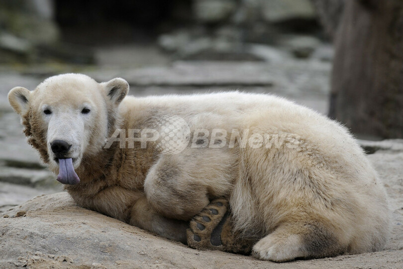 ドイツ南部ニュルンベルク(Nuremberg)の動物園で、同じく母クマに育児放棄され、飼育係に育てられている「妹分」のフロッケ(Flocke)が人気を博すなか、成長したクヌートにも再び注目が集まっている。(c)AFP