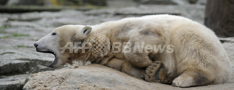 ドイツ南部ニュルンベルク(Nuremberg)の動物園で、同じく母クマに育児放棄され、飼育係に育てられている「妹分」のフロッケ(Flocke)が人気を博すなか、成長したクヌートにも再び注目が集まっている。(c)AFP