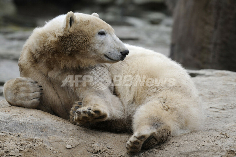 ドイツ南部ニュルンベルク(Nuremberg)の動物園で、同じく母クマに育児放棄され、飼育係に育てられている「妹分」のフロッケ(Flocke)が人気を博すなか、成長したクヌートにも再び注目が集まっている。(c)AFP