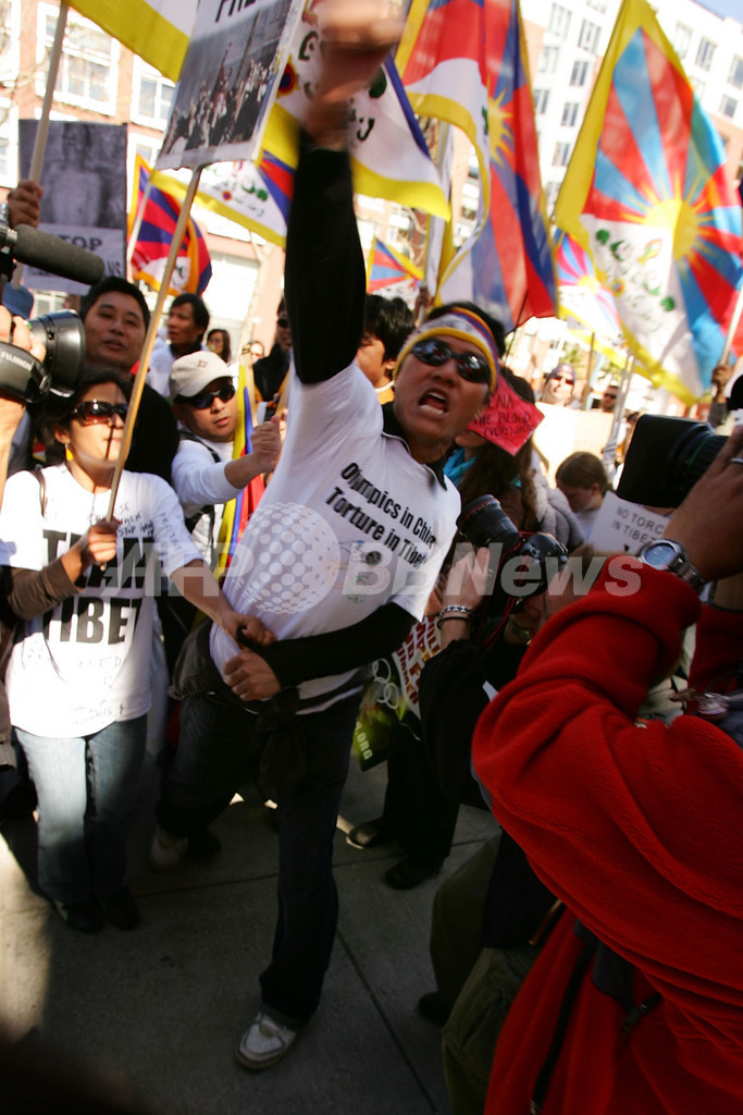 【4月10日 AFP】(写真追加)米サンフランシスコ(San Francisco)で9日行われた北京五輪の聖火リレーで、出発地点付近でチベット(Tibet)の旗を振ろうとした中国系米国人が中国政府支持派の人びとに囲まれ、小競り合いとなる騒ぎがあった。
