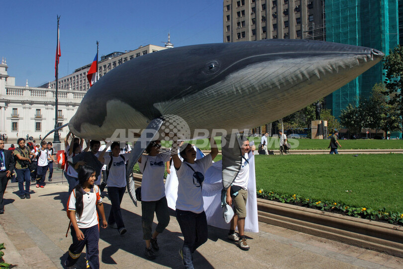 ニュース 環境・科学 クジラ保護区設置求め、チリ大統領府前でデモ 2008年4月10日 17:20 発信地:サンティアゴ/チリ [ 中南米 チリ ] このニュースをシェア ‹ › ❮ 3/3 ❯ 2008年4月8日、チリの首都サンティアゴ(Santiago)の大統領府前で、クジラ保護区設置を求め巨大なクジラの模型を担ぎデモ行進する環境保護団体Center of Cetacean Conservation(鯨類保護センター)。(c)AFP/RAUL BRAVO 画像作成中 ! 【4月10日 AFP】南米チリの首都サンティアゴ(Santiago)で8日、環境保護団体が領海にクジラの保護区の新設を求めて大統領府前でデモを行った。(c)AFP 環境・科学 一覧へ> メディア・報道関係・法人の方向け 写真・動画 購入のお問合せ>