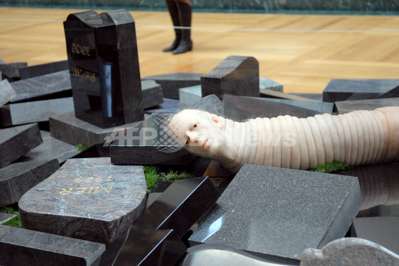 今回の個展には、巨大なミミズに自分の顔を合体させた作品、生け贄として捧げられた子羊、クジャクの剥製など39点が展示されている。 会期は7月7日まで。(c)AFP