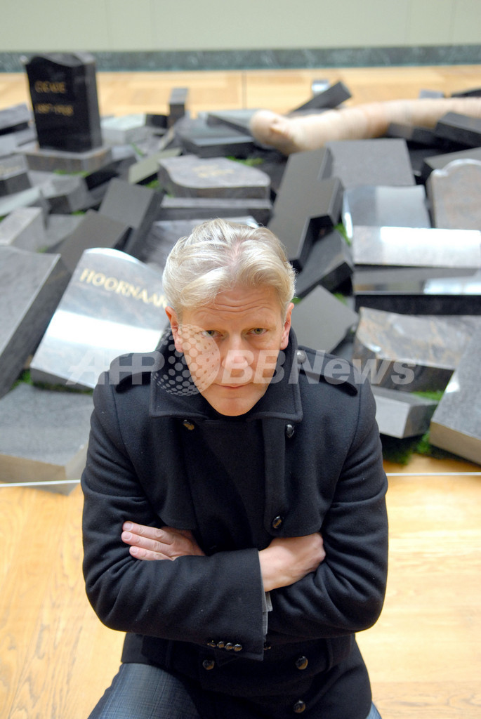 今回の個展には、巨大なミミズに自分の顔を合体させた作品、生け贄として捧げられた子羊、クジャクの剥製など39点が展示されている。 会期は7月7日まで。(c)AFP