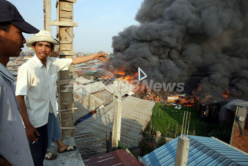 プノンペンではこのような大規模な近隣火災は減少しつつあるが、数年前にも複数のスラム地区で不審火が発生し、数万人が避難生活を余儀なくされた。(c)AFP