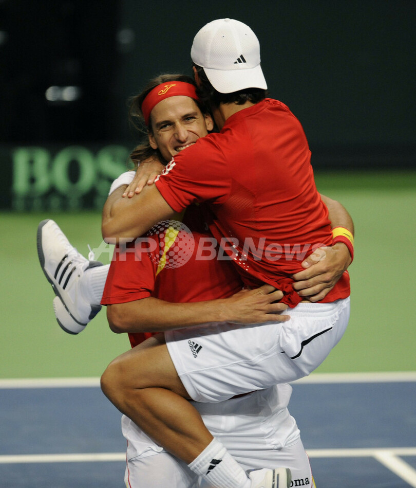 【4月13日 AFP】男子テニス・デビスカップ(2008 Davis Cup)・ワールドグループ2008・準々決勝、ドイツvsスペイン。スペインのフェリシアーノ・ロペス(Feliciano Lopez)/フェルナンド・ベルダスコ(Fernando Verdasco)組は第3試合のダブルスでドイツのフィリップ・コールシュライバー(Philipp Kohlschreiber)/フィリップ・ペッツシュナー(Philipp Petzschner)組と対戦。ロペス/ベルダスコ組はセットカウント3-2(6-7、7-6、6-4、2-6、12-10)でコールシュライバー/ペッツシュナーを降し、スペインが3勝目を挙げて勝利を収めた。スペインは米国対フランスの勝者と9月19日から21日の日程で行われる準決勝で対戦する。(c)AFP/Mark Oakley