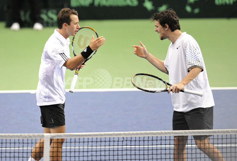 【4月13日 AFP】男子テニス・デビスカップ(2008 Davis Cup)・ワールドグループ2008・準々決勝、ドイツvsスペイン。スペインのフェリシアーノ・ロペス(Feliciano Lopez)/フェルナンド・ベルダスコ(Fernando Verdasco)組は第3試合のダブルスでドイツのフィリップ・コールシュライバー(Philipp Kohlschreiber)/フィリップ・ペッツシュナー(Philipp Petzschner)組と対戦。ロペス/ベルダスコ組はセットカウント3-2(6-7、7-6、6-4、2-6、12-10)でコールシュライバー/ペッツシュナーを降し、スペインが3勝目を挙げて勝利を収めた。スペインは米国対フランスの勝者と9月19日から21日の日程で行われる準決勝で対戦する。(c)AFP/Mark Oakley