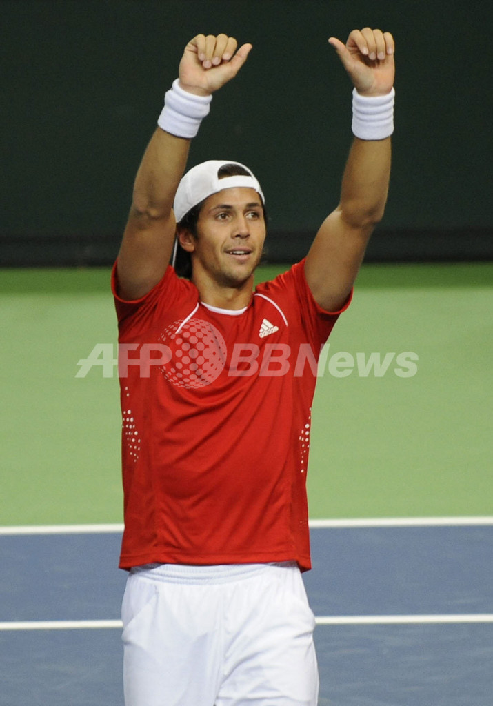 【4月13日 AFP】男子テニス・デビスカップ(2008 Davis Cup)・ワールドグループ2008・準々決勝、ドイツvsスペイン。スペインのフェリシアーノ・ロペス(Feliciano Lopez)/フェルナンド・ベルダスコ(Fernando Verdasco)組は第3試合のダブルスでドイツのフィリップ・コールシュライバー(Philipp Kohlschreiber)/フィリップ・ペッツシュナー(Philipp Petzschner)組と対戦。ロペス/ベルダスコ組はセットカウント3-2(6-7、7-6、6-4、2-6、12-10)でコールシュライバー/ペッツシュナーを降し、スペインが3勝目を挙げて勝利を収めた。スペインは米国対フランスの勝者と9月19日から21日の日程で行われる準決勝で対戦する。(c)AFP/Mark Oakley