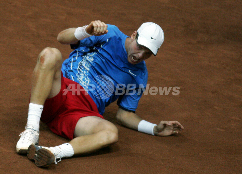 【4月12日 AFP】男子テニス・デビスカップ(2008 Davis Cup)・ワールドグループ2008・準々決勝、ロシアvsチェコ。ロシアのニコライ・ダビデンコ(Nikolay Davydenko)は、第4試合のシングルスでチェコのトマス・ベルディハ(Tomas Berdych)と対戦。試合はセットカウント2-2(6-3、2-6、6-7、6-3)で迎えた最終セットにベルディハが途中棄権したため、ダビデンコが勝利を収めた。この結果通算成績を3勝1敗としたロシアはチェコを降し、準決勝進出を決めた。(c)AFP