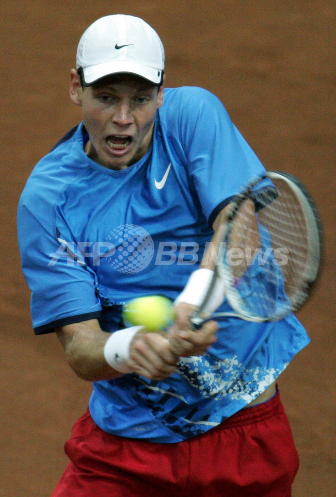 【4月12日 AFP】男子テニス・デビスカップ(2008 Davis Cup)・ワールドグループ2008・準々決勝、ロシアvsチェコ。ロシアのニコライ・ダビデンコ(Nikolay Davydenko)は、第4試合のシングルスでチェコのトマス・ベルディハ(Tomas Berdych)と対戦。試合はセットカウント2-2(6-3、2-6、6-7、6-3)で迎えた最終セットにベルディハが途中棄権したため、ダビデンコが勝利を収めた。この結果通算成績を3勝1敗としたロシアはチェコを降し、準決勝進出を決めた。(c)AFP