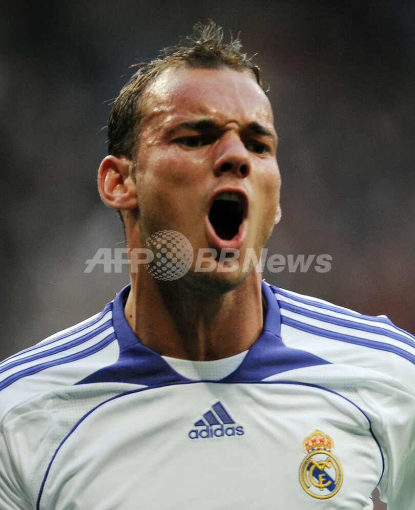 後半13分にウェズレイ・スナイデル(Wesley Sneijder)が決勝点を決めて勝利したレアル・マドリードは、リーグで2位につけるFCバルセロナ(FC Barcelona)との勝ち点差を9に広げた。(c)AFP/Phil Seery