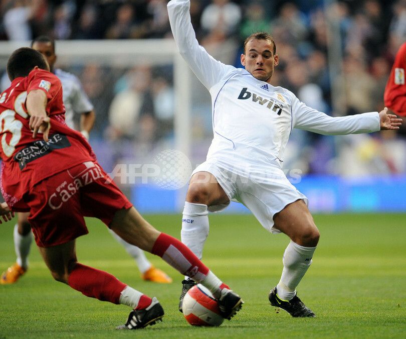 後半13分にウェズレイ・スナイデル(Wesley Sneijder)が決勝点を決めて勝利したレアル・マドリードは、リーグで2位につけるFCバルセロナ(FC Barcelona)との勝ち点差を9に広げた。(c)AFP/Phil Seery