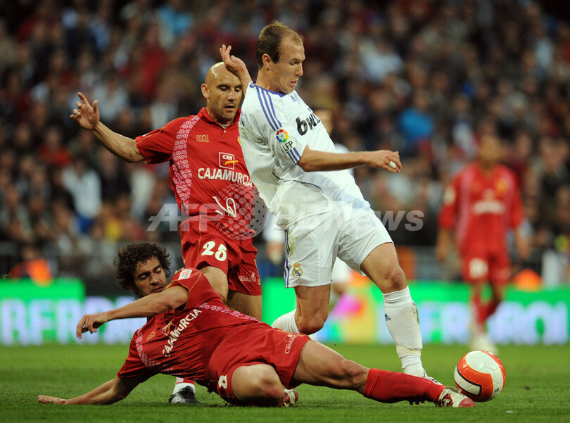【4月14日 AFP】07-08スペイン・リーガエスパニョーラ1部・第32節、レアル・マドリード(Real Madrid)vsムルシア(Real Murcia)。試合はミゲル・トーレス(Miguel Torres)が退場になり、その後の70分間を10人で戦うことを余儀なくされたレアル・マドリードが1-0で勝利を収めた。