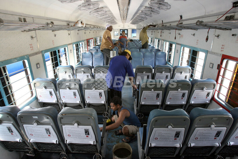 インド・コルカタ(Kolkata)駅で、14日から同地とバングラデシュのダッカ(Dhaka)を結ぶ「Maitree Express(友好エキスプレス)」の車両内の清掃を行う鉄道作業員(2008年4月12日撮影)。(c)AFP/Deshakalyan CHOWDHURY