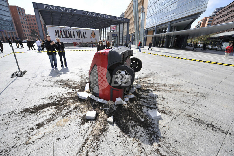 ニュース ライフ こぼれ話 上空から自動車が激突? ポツダム広場に風変わりな3D広告 2008年4月15日 12:48 発信地:ベルリン/ドイツ [ ヨーロッパ ドイツ ] このニュースをシェア ‹ › ❮ 1/2 ❯ ベルリン(Berlin)のポツダム広場(Potsdamer Platz)に展示されている舗道にめり込んだ自動車の立体彫刻(2008年4月14日撮影)。(c)AFP/JOHN MACDOUGALL 画像作成中 ! 【AFP】ドイツの首都ベルリン(Berlin)にあるポツダム広場(Potsdamer Platz)で、舗道に垂直にめり込んだ状態の自動車の立体彫刻が展示されている。この作品は、ドイツの動画投稿サイトの宣伝を目的として設置されたもの。(c)AFP ライフ 一覧へ> メディア・報道関係・法人の方向け 写真・動画 購入のお問合せ>