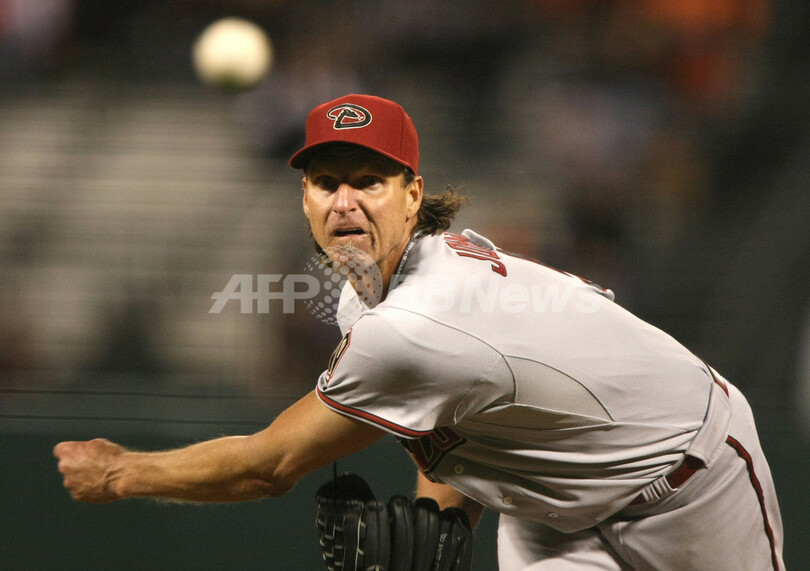 【AFP】08MLB、アリゾナ・ダイヤモンドバックス(Arizona Diamondbacks)のランディ・ジョンソン(Randy Johnson)は、現地14日に行われたサンフランシスコ・ジャイアンツ(San Francisco Giants)戦に先発登板し、5回を投げ3安打3失点(自責点0)で降板した。試合は7回裏にダイヤモンドバックスがジャイアンツに逆転を許し4-5で敗れたため、ランディ・ジョンソンはシーズン初登板を勝利で飾ることができなかった。(c)AFP/Getty Images