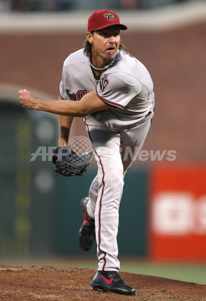 【AFP】08MLB、アリゾナ・ダイヤモンドバックス(Arizona Diamondbacks)のランディ・ジョンソン(Randy Johnson)は、現地14日に行われたサンフランシスコ・ジャイアンツ(San Francisco Giants)戦に先発登板し、5回を投げ3安打3失点(自責点0)で降板した。試合は7回裏にダイヤモンドバックスがジャイアンツに逆転を許し4-5で敗れたため、ランディ・ジョンソンはシーズン初登板を勝利で飾ることができなかった。(c)AFP/Getty Images