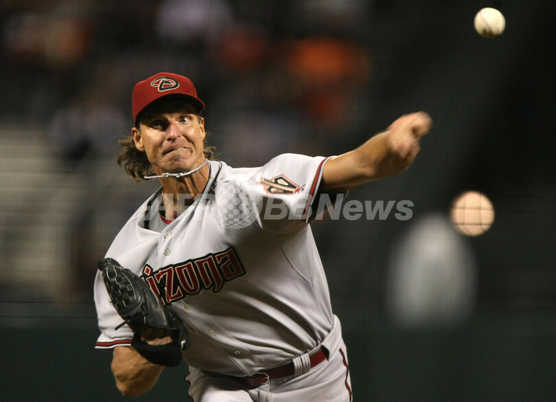 【AFP】08MLB、アリゾナ・ダイヤモンドバックス(Arizona Diamondbacks)のランディ・ジョンソン(Randy Johnson)は、現地14日に行われたサンフランシスコ・ジャイアンツ(San Francisco Giants)戦に先発登板し、5回を投げ3安打3失点(自責点0)で降板した。試合は7回裏にダイヤモンドバックスがジャイアンツに逆転を許し4-5で敗れたため、ランディ・ジョンソンはシーズン初登板を勝利で飾ることができなかった。(c)AFP/Getty Images
