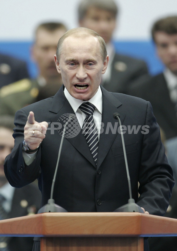 大統領は国営テレビが生中継した演説で、「党員や党幹部の提言を感謝して受け入れる。新たな責任を引き受け、統一ロシアを導く用意はできている」と決意表明したが、メドべージェフ氏の大統領就任を間近に控え、ロシアの政治構造再編を示唆するものとなった。(c)AFP/Sebastian Smith