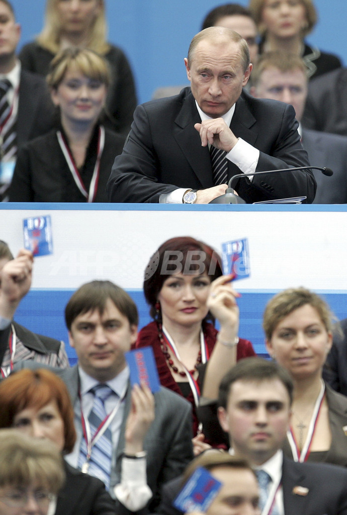 大統領は国営テレビが生中継した演説で、「党員や党幹部の提言を感謝して受け入れる。新たな責任を引き受け、統一ロシアを導く用意はできている」と決意表明したが、メドべージェフ氏の大統領就任を間近に控え、ロシアの政治構造再編を示唆するものとなった。(c)AFP/Sebastian Smith