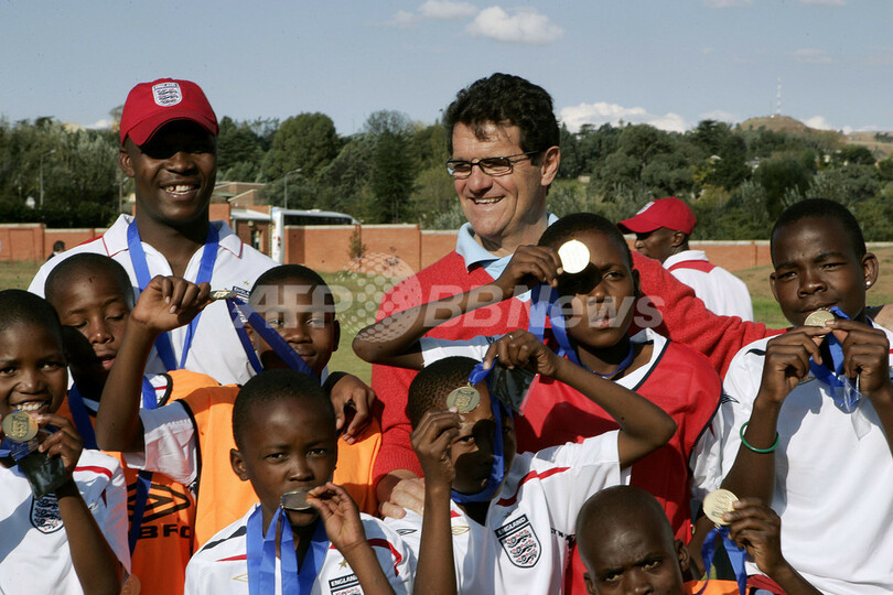 【AFP】サッカーイングランド代表のファビオ・カペッロ(Fabio Capello)監督は15日、2010年サッカーW杯南アフリカ大会(2010 World Cup)に先立ちアフリカ人指導者の質の向上を目指す国際サッカー連盟(Federation Internationale de Football Association、FIFA)のプログラムのため、アフリカ南部の国レソト(Lesotho)を訪れ、首都マセル(Maseru)のレソト・サッカー協会(Lesotho Football Association、LEFA)で、現地の子供たちの練習を視察した。(c)AFP