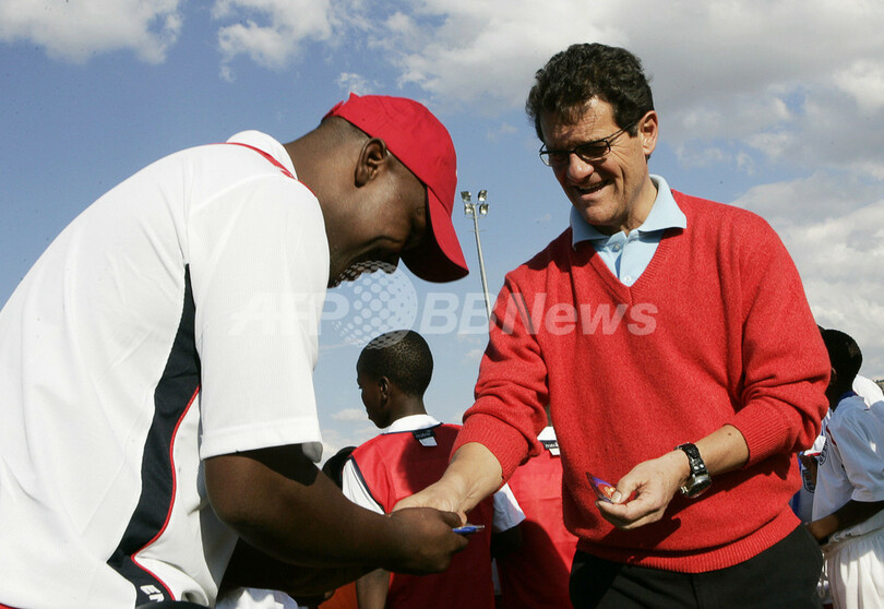 【AFP】サッカーイングランド代表のファビオ・カペッロ(Fabio Capello)監督は15日、2010年サッカーW杯南アフリカ大会(2010 World Cup)に先立ちアフリカ人指導者の質の向上を目指す国際サッカー連盟(Federation Internationale de Football Association、FIFA)のプログラムのため、アフリカ南部の国レソト(Lesotho)を訪れ、首都マセル(Maseru)のレソト・サッカー協会(Lesotho Football Association、LEFA)で、現地の子供たちの練習を視察した。(c)AFP