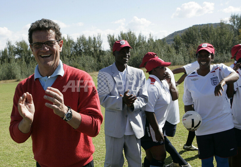 【AFP】サッカーイングランド代表のファビオ・カペッロ(Fabio Capello)監督は15日、2010年サッカーW杯南アフリカ大会(2010 World Cup)に先立ちアフリカ人指導者の質の向上を目指す国際サッカー連盟(Federation Internationale de Football Association、FIFA)のプログラムのため、アフリカ南部の国レソト(Lesotho)を訪れ、首都マセル(Maseru)のレソト・サッカー協会(Lesotho Football Association、LEFA)で、現地の子供たちの練習を視察した。(c)AFP