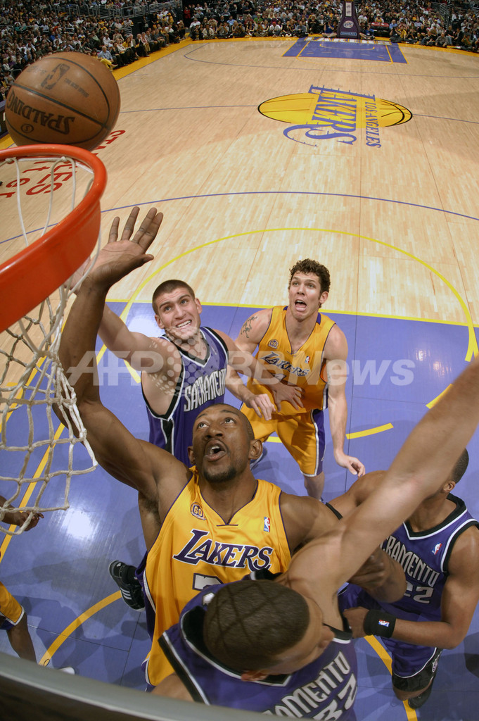 【4月16日 AFP】(写真追加)07-08NBA、ロサンゼルス・レイカーズ(Los Angeles Lakers)vsサクラメント・キングス(Sacramento Kings)。試合はパウ・ガソル(Pau Gasol)がチーム最多の22得点を記録し、レイカーズが124-101でキングスを下し、プレーオフの西カンファレンス第1シードを確保し、さらにプレーオフでのホームコートアドバンテージを獲得した。